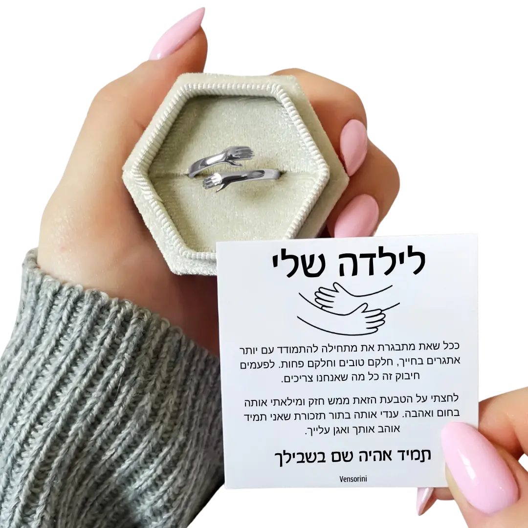 עיצובה המיוחד של הטבעת מסמל חיבוק חם ומגן, כזה שמלווה אותה בכל מקום. זה לא רק חפץ – זו תזכורת מוחשית לכך שאתם תמיד שם עבורה, אפילו מרחוק.