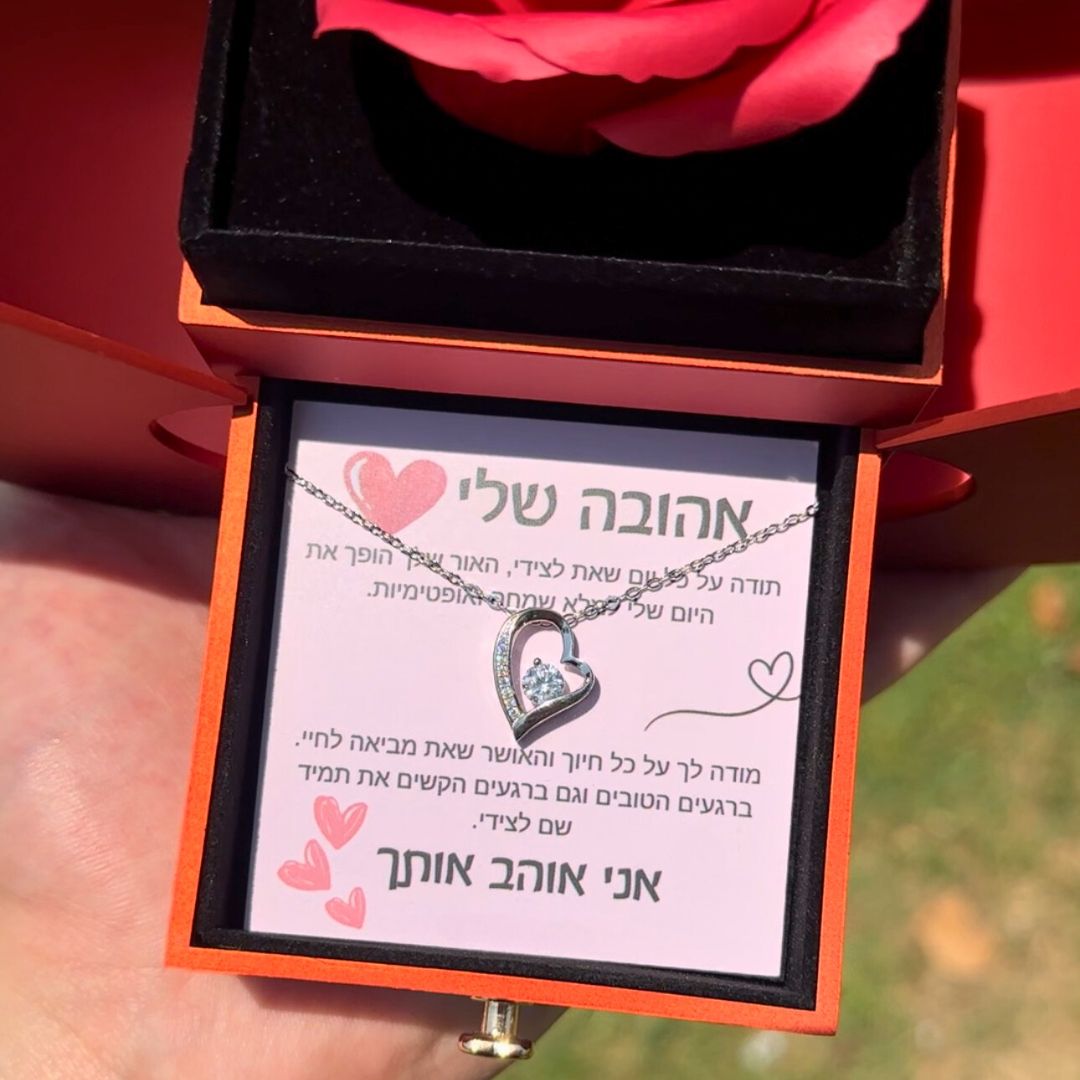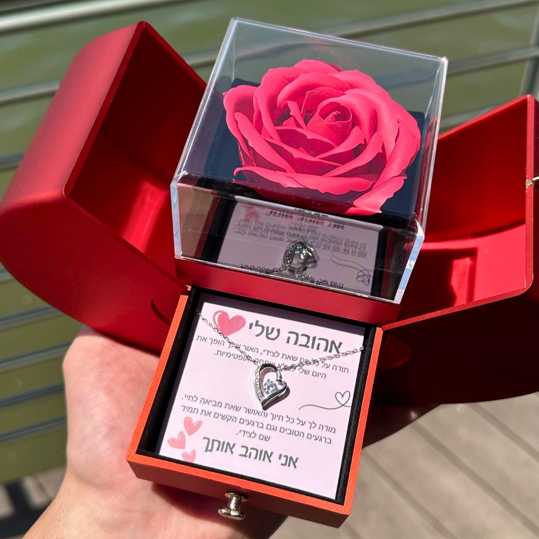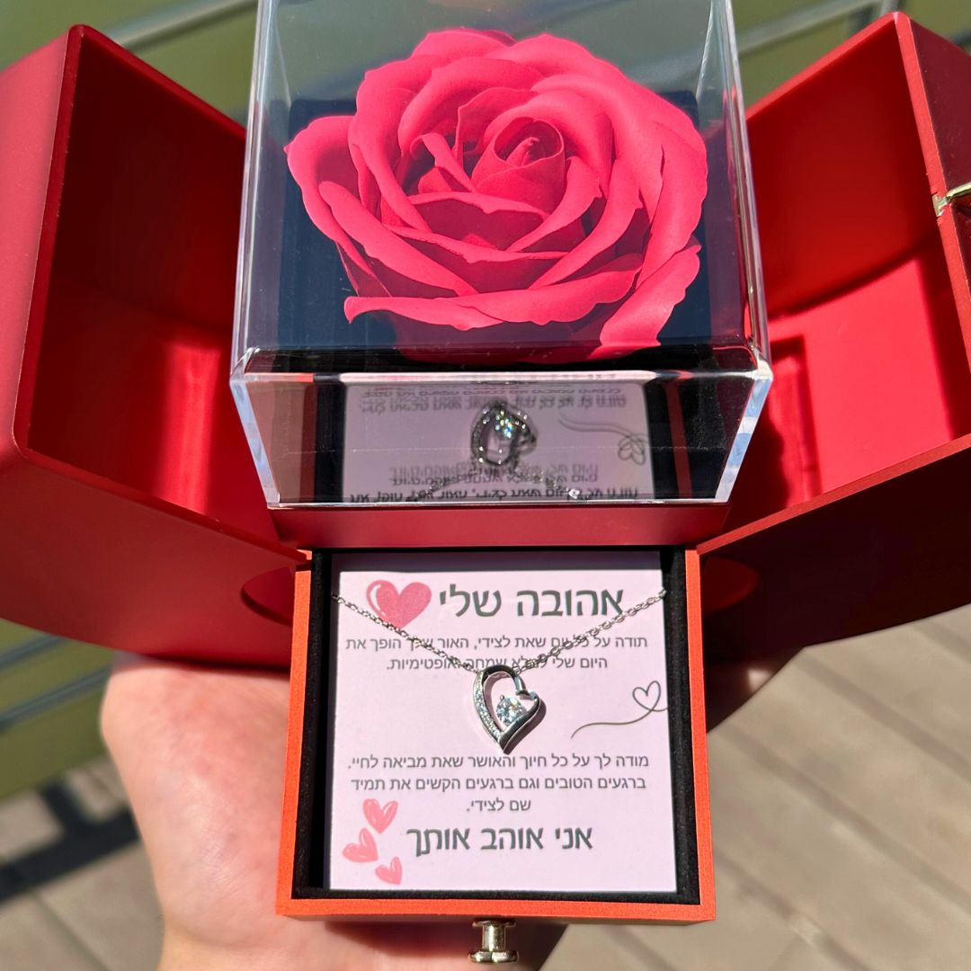 דמיינו את התגובה שלה כשהיא פותחת את הקופסה רואה את הורד ולאחר מכן פותחת את המגירה הקטנה ומגלה תכשיט עם כרטיס ברכה מרגש. זאת מתנה מרגשת שהיא לא תשכח - הפתיעו אותה עם מתנה באמת מיוחדת שהיא תוכל לשמור לנצח. זאת לא עוד סתם מתנה אלא תזכורת לאהבה שלכם בכל פעם שהיא עונדת את השרשרת.